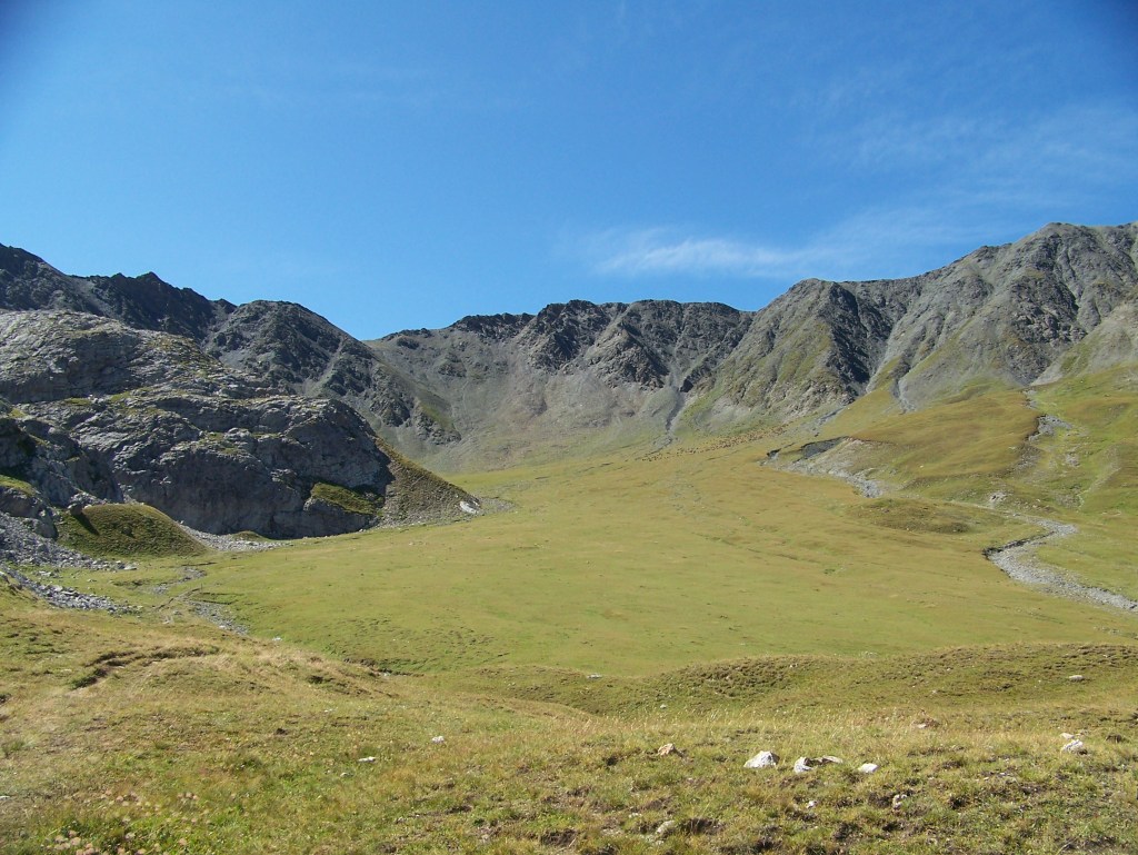Un gomphocère popeye (Gomphocerus sibiricus) stridule au premier plan, tandis que dans le fond du vallon, les sonnailles d’un troupeau de brebis montent jusqu’à moi. Un peu plus tard, des randonneurs imprudents alertent les patous, qui veillaient jusqu’alors silencieusement sur le troupeau.