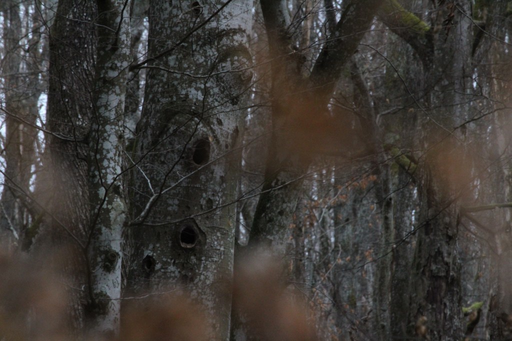 La vallée résonne du tambourinage des pics épeiches (Dendrocopos major). Jouant avec l’air, les pigeons ramiers (Columba palumbus) passent et repassent devant les microphones. D’autre fous volants se mêlent à la ronde. Sûrement les pics épeiches (Dendrocopos major) que l’on entend également picoter les branches.